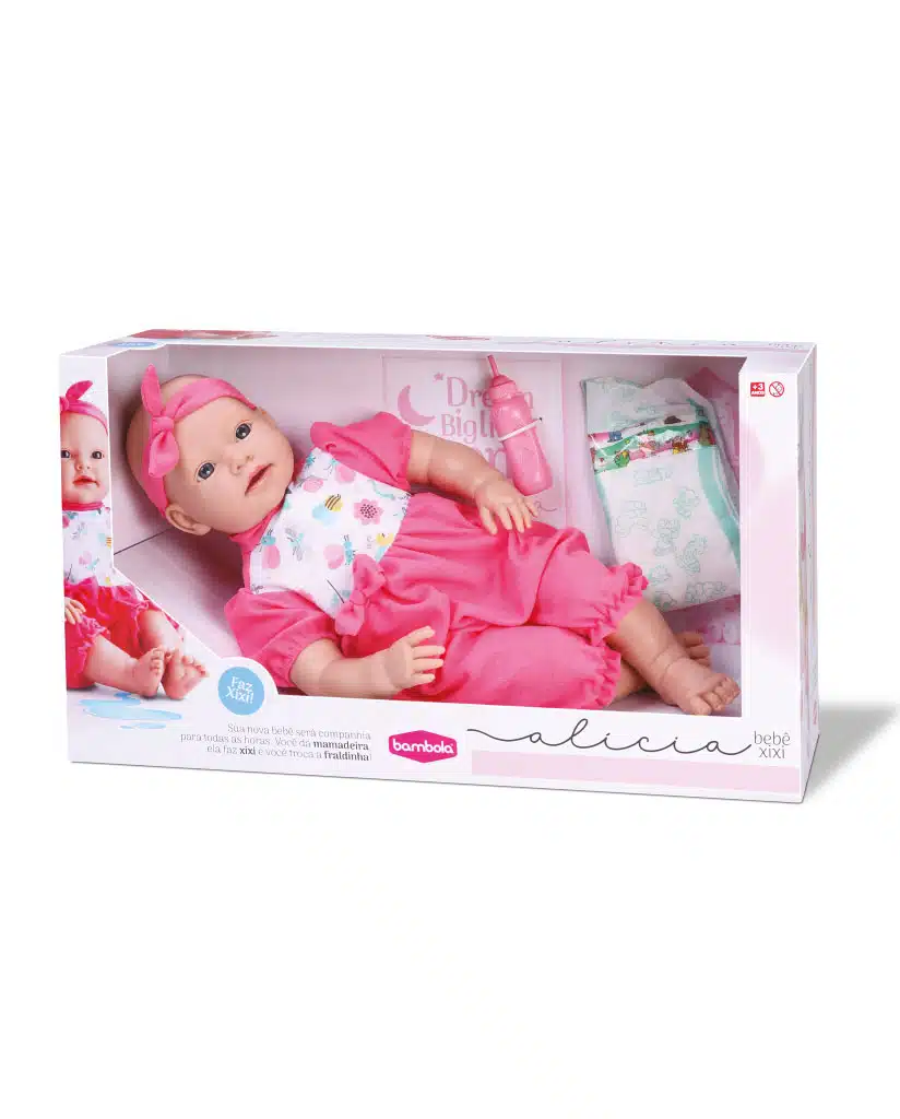 Sua nova bebê será companhia para todas as horas. Você dá mamadeira, ela faz xixi e você troca a fraldinha!